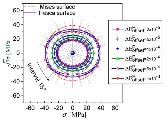 A family of the initial yield surfaces is determined by radial proportional stress-controlled paths with different ratio of shear stress to tensile stress ranging from 0° to 360° with 15° intervals with the different offset strain by using the GLBM, as shown in Figure 10. Firstly, we observe that the yield surfaces are close to isotropic expansion in the (, ) plane with the increasing offset strains whose shape is smooth convex ellipses with two axes of symmetry: the tensile stress axis and the shear stress axis . The shape of the initial yield surfaces is independent of the yield definition choice, but the size of the initial yield surfaces is dependent on the various offset strain values. By comparison, for instance, the tensile and reverse compressive yield stress (38.8, −38.8 MPa) are higher than the shear yield stress and reverse shear (33.87, −33.87 MPa) for a specified offset strain of 1000 με. The initial yield surface of the polycrystal aluminum may be described by the Tresca yield criterion.