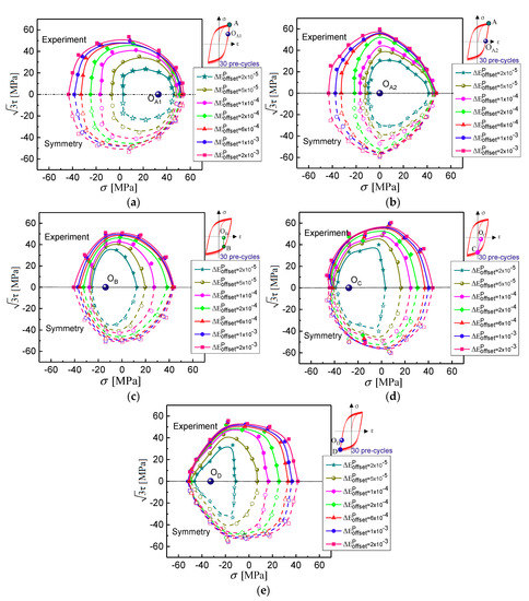 The experimental subsequent yield surfaces under the above five different unloading cases are plotted in Figure 11, the distinct features of the yield surface for anisotropic yielding can be observed. The subsequent yield surfaces expand rapidly towards the reverse loading direction and shrinks in the direction perpendicular to the pre-loading direction but has little influence in pre-deformation direction. This suggests a rapid hardening of slip under the reverse loading condition and a slow hardening in the preloading direction that dominates deformation under tension (or compression). This is the cause of the higher curvature of yield surface in the pre-loading direction than that in the other directions, and as a result, the subsequent yield surfaces exhibit the “sharp corner” in the pre-deformation direction and flat in its reverse direction. The anisotropic hardening characteristics of the subsequent yield surface strongly depend on the direction of the accumulated plastic strain, which is verified that the “sharp corner” of yield surfaces points to the pre-deformation direction corresponding to tension or compression, seen Figure 11, and their expansion and translation in the stress space are clearly observed. The yield surfaces are approximately symmetric about the stress axis located in the pre-loading direction. In Figure 11a,b, the effects of the unloading points OA1 and OA2 on the evolution of the yield surfaces are displayed. By comparison of the different unloading points, the results of the numerical and experimental study reveal that the yield surface distortion in the pre-loading direction becomes more evident owing to the unloading range increased (A-OA2) and the size of yield surfaces becomes shrinkage due to the small reverse plastic deformation at OA2 as the smaller offset strain of 20 με and 50 με, the yield surface in stress space is also translated observably.