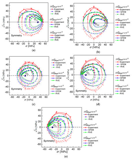 To verify the predictive capabilities of the approach under various levels of the finite element models (FEM) from a micro material point (RVE) to macro specimen (GFEM) scale transition, the first scheme adopted here is the GFEM to simulate a same test specimen with the constrained and loaded conditions corresponding to the axial and torsional deformation history consistent with experiments. In the second scheme, the polycrystalline aggregate RVE model containing 125 grains is adopted to simulated a material point of specimen gauge section, and to reflect the continuity of deformation during loading, the RVE model is applied with the periodic boundary conditions, the macroscopic deformation is controlled by applying displacement and load on the master node of the model, as shown in Figure 6b. The subsequent yield surfaces at five unloading cases with different offset strain are presented with the GFEM and RVE models in Figure 12. As a compromise between accuracy and computational cost, the response of macroscopic deformation is believed to be better approximated when the GFEM is adopted in this study, whereas the RVE model provides a computationally cheap estimate for the polycrystalline response although it expects to be relatively inaccurate. The GFEM systematically predicts the yield surfaces which are slightly larger than the ones by RVE, as it corresponds to the same offset strain due to the development of lattice preferred orientations. As a consequence, there is a nearly indistinguishable difference in the predicted subsequent yield surfaces between the GFEM and the RVE model. The coincidence is attributed to the low sensitivity of finite element model sizes.