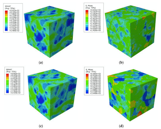 The accumulated equivalent plastic strain and Mises stress contours of a 3D Voronoi polycrystalline aggregate with offset strain of 20 μm and 1000 μm along 180° reloading path at unloading point D-OD after 30 tension-compression cycles: (a) equivalent plasticity strain contour with 20 με offset strain; (b) Mises stress contour with 20 με offset strain; (c) equivalent plasticity strain contour with 1000 με offset strain; (d) Mises stress contour with 100 με offset strain.