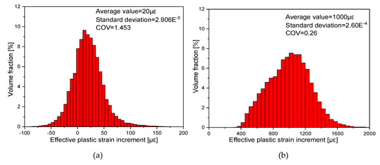 To compare the inhomogeneity of equivalent plastic strain increment with different offset strain, a coefficient of variation (COV) was defined as the ratio of the standard deviation S of the accumulated effective plastic strain increment to its average absolute value [10]. Figure 14 illustrates the relation curves between the COV of the equivalent plastic strain increment and offset strain ranging from 20 με to 1000 με along various reloading paths from 0° to 180° with interval 30° at unloading point D-OD after 30 tension-compression cycles. The results show that heterogeneous distributions of strain and stress can be clearly observed in Figure 14 with increasing deformation as accumulated equivalent plasticity strain increments, respectively. For example, the COV of the equivalent plastic strain increment corresponding to the target offset strain of 20 με and 1000 με decreases from 1.453 to 0.26 at the reloading direction of 180° and the statistical-numerical distribution of the equivalent plastic strain increment are shown in Figure 15. These results demonstrate that with a very small offset strain, the representative volume element (RVE) presents very serious heterogeneity leading to anisotropy distortion of the yield surface due to a small amount of elements and grains generating new plastic strain in the RVE. However, if the larger offset strain is chosen, numerous elements and grains occur with new plastic deformation in the RVE, which leads to the plastic deformation of material tending to be homogeneous. By comparison with the same offset strain, as shown in Figure 14, the higher heterogeneity in the preloading direction is revealed than that towards the reverse loading direction. Therefore, no violation of the convexity can be regarded as a requirement for choosing the proper specified offset strain.