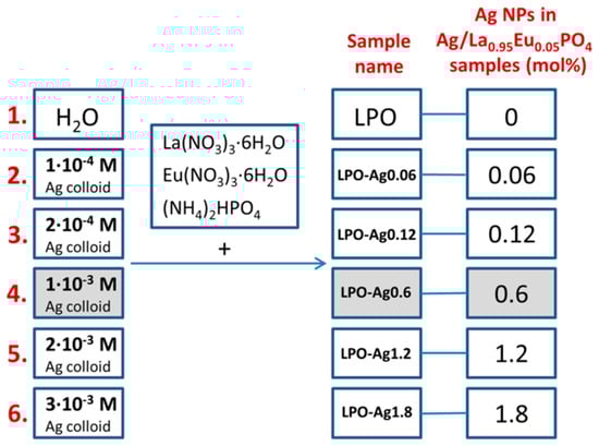 A set of six samples was prepared by the conventional hydrothermal synthesis. Five samples were prepared by using silver colloids of different concentrations (1 × 10−4 M; 2 × 10−4 M; 1 × 10−3 M; 2 × 10−3 M; 3 × 10−3 M) as a medium, while one sample was prepared in water (see Figure 1 for the sample’s names and Ag NPs mol %). The mole percentages (mol %) of Ag NPs in the samples were calculated relative to the overall content in the Ag/La0.95Eu0.05PO4 nanostructures. According to our previous results [13], there is no concentration quenching in RE3+-doped LaPO4 NPs and the emission intensity increases with an increase in RE3+ dopant concentration up to the full substitution of La3+ with RE3+. We chose the La0.95Eu0.05PO4 system where the Eu3+ emission is strong enough so that the effect of Ag NPs on the luminescence efficiency can be clearly observed.