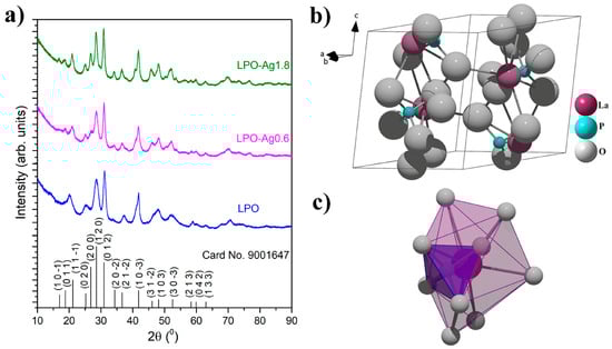 (a) XRD patterns of the representative LPO, LPO–Ag0.6, and LPO–Ag1.8 samples. The diffraction peaks are indexed according to the Crystallography Open Database - COD card No. 9001647. Lanthanum phosphate (LaPO4); (b) unit cell; and (c) coordination polyhedron around La3+.