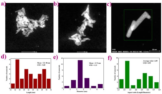 Transmission electron microscopy images showing: (a–c) anisotropic rod-like shape particles with an aggregation tendency; (d–f) average length/diameter/aspect ratio histograms.