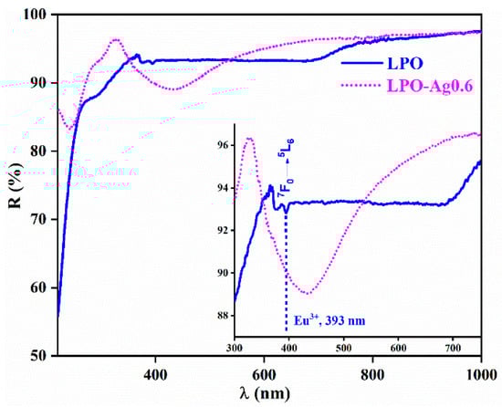 Figure 4 shows the diffuse reflectance spectra of the representative LPO and LPO–Ag0.6 samples. The sample with the Ag NPs clearly shows a typical broad band centred at 430 nm originating from the Ag surface plasmon resonance [40,41]. On the other hand, the sample without Ag NPs shows only weak bands that correspond to the Eu3+ transitions with the most distinguished 7F0→5L6 absorption placed ~ 393 nm. An enlarged inset clearly shows how Ag plasmon absorption overlaps the 7F0→5L6 absorption band of the Eu3+ ion [42,43].
