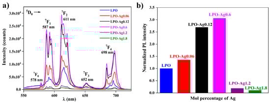 Figure 6a shows the photoluminescence spectra of all six samples, the LPO and the five samples with different concentrations of Ag NPs. Five characteristic Eu3+ emission bands associated with 5D0 → 7FJ (J = 0, 1, 2, 3, 4) spin forbidden f–f transitions, are visible around 578, 587, 611, 652, and 698 nm, respectively. It is well known that the 5D0 → 7F1 transition of Eu3+ ion is the parity-allowed magnetic dipole transition (ΔJ = 1) and its intensity does not vary with the host. On the other hand, red 5D0 → 7F2 electric dipole transition (ΔJ = 2) is highly sensitive to the local environment, and its intensity decreases with an increase in the symmetry of the crystal field around the europium ion. In the given structure, the Eu3+ ion replaces La3+ in the non-centrosymmetric C1 crystallographic site. It is generally acknowledged that the observation of the dominant 5D0 → 7F2 line and completely forbidden 5D0 → 7F0 transition indicates that Eu3+ ion is located in a structural site without a inversion centre (such as C1) [42,43]. This is in agreement with the observed photoluminescence spectra where the red emission arising from the 5D0 → 7F2 transition is more intense compared to the 5D0 → 7F1 emission.