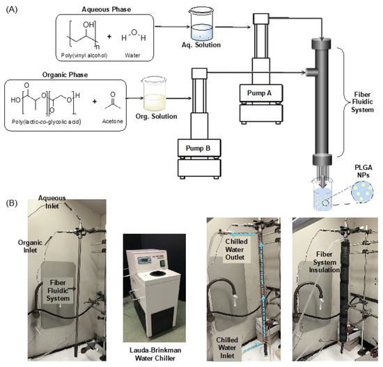 Fiber reactor setup. (A) Schematic of experimental fiber fluidic system setup. The fiber fluidic system has two inlets that are fed with syringe pumps. The aqueous phase, including poly (vinyl alcohol) (PVA) as a stabilizer, enters the system first, wetting the fibers. The organic phase, containing the polymer poly(lactic-co-glycolic acid) (PLGA) and active agents, is fed downstream. Nanoparticle (NP) suspensions exit the fiber reactor through the outlet, which is open to atmospheric pressure. (B) Left to right: Images of the bare fiber fluidic system, water chiller, fiber fluidic system wrapped with cooling coil, and fiber fluidic system with cooling coil and insulation.