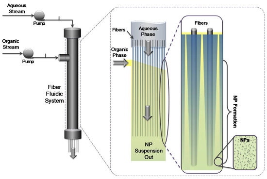 In this work, we introduced a facile and efficient process to make polymeric NPs in a continuous process through nanoprecipitation, which is one of the most common methods, utilizing a fiber reactor system. The fiber reactor is a relatively small and straightforward instrument with no moving parts. The results show the successful production of monodispersed NPs on a large scale. NP size, which is the most crucial feature of NPs utilized in all of the biomedical applications, was readily adjusted by considering the process factors discussed in the paper, including the concentration and flow rate ratio of the feed streams. The concentration of feed streams had the most influence on the size of the final product. We also fabricated NPs that encapsulated a fluorescent dye, rhodamine 6G, on a large scale. The straightforward design and easy operation of the fiber reactor, together with the high level of control over NP size and PDI, make this system an excellent candidate for use in the pharmaceutical industry, for the scale up of nanomedicine formulations.