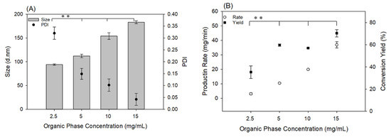 Effect of PLGA concentration on (A) NP size and PDI and (B) production rate and conversion yield. For this study, the flowrate of the PLGA solution (organic stream) was 3.5 mL/min, and the concentration and flowrate of the PVA solution (aqueous stream) was 10 mg/mL and 25 mL/min, respectively. ** Statistically significant difference in the size, PDI, production rate and conversion yield among all organic phase concentrations tested (p < 0.05).