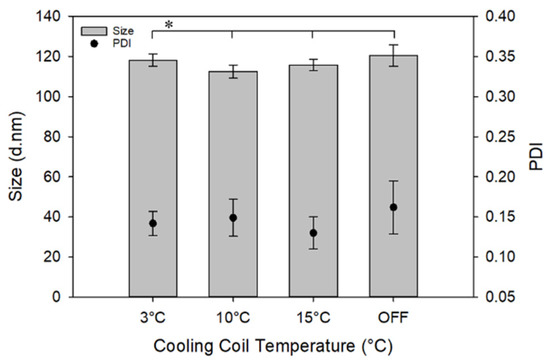 Effect of temperature of cooling coil on NP size and PDI. For this study, concentration and flowrate of the PLGA solution (organic stream) was 5 mg/mL and 3.5 mL/min, and that of the PVA solution (aqueous stream) was 10 mg/mL and 25 mL/min, respectively. * No statistically significant difference in the size or PDI of NPs as a function of cooling coil temperature (p > 0.05).