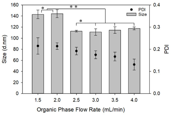 Effect of the flowrate ratio on NP size and PDI. For this study, the concentration and flowrate of the PVA solution (aqueous stream) was 10 mg/mL and 25 mL/min, respectively. The concentration of PLGA solution was 5 mg/mL, and its flowrate varied from 1.5 to 4 mL/min. * No statistically significant difference in the size of the NPs prepared with 1.5 or 2.0 mL/min organic phase flow rate, or between the NPs prepared with 2.5 to 4.0 mL/min organic phase flow rate (p > 0.05). ** Statistically significant difference between the size of NPs prepared with 1.5–2.0 mL/min and those prepared with 2.5–4.0 mL/min organic phase flow rate (p < 0.05).