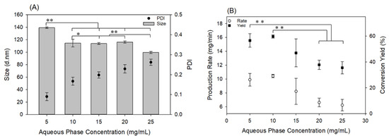 Effect of PVA concentration on aqueous phase on (A) NP size and PDI and (B) production rate and conversion yield. For this study, the flowrate of the PVA solution (aqueous stream) was 25 mL/min, and the concentration and flowrate of the PLGA solution (organic stream) was 5 mg/mL and 3.5 mL/min, respectively. In (A): * No statistically significant difference between the size of NPs prepared with the aqueous phase concentration at 10, 15, or 20 mg/mL (p > 0.05). ** Statistically significant difference in the size of NPs prepared with the aqueous phase at 5 mg/mL, and all higher aqueous phase concentrations, as well as between that of the NPs prepared with the aqueous phase at 25 mg/mL and at the lower aqueous phase concentrations (p < 0.05). In (B): ** Statistically significant difference in the production rate and conversion yield of NPs prepared with aqueous phase concentration at 5 and 10 mg/mL vs. that of NPs prepared with 20 and 25 mg/mL.