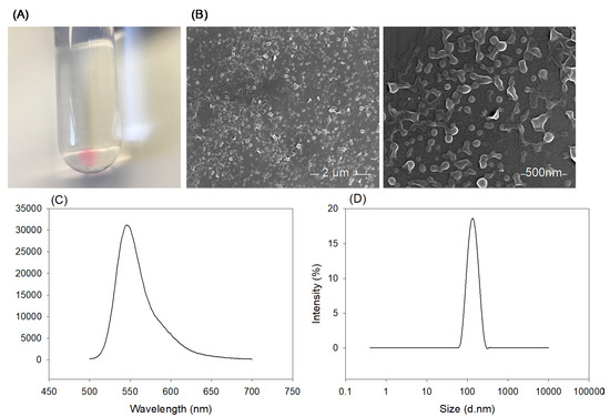 (A) Image of Rhodamine 6G-loaded PLGA NPs upon centrifugation, confirming their loading with the dye. (B) SEM images, (C,D) fluorescence spectrum (EX = 480 nm), and size distribution of Rhodamine 6G-loaded PLGA NPs.