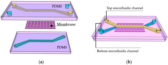 Organs-on-chips (OoC) are complex devices comprising a chip body, a microfluidic structure made of biocompatible transparent polymer, and a “living part”—2D- and/or 3D-cultured cells. These devices are used to study the behavior of cells and develop an understanding of their interaction. Over the past decade, numerous cell growth forms inside the channel have been reported, including micro-3D tissues [], spheroids [], vessels [], and wires []. One of the advantages of OoC devices is the possibility to combine 2D and 3D features into a single structure. Of these, 3D cell culturing methods have their benefits, such as more extensive cell-to-cell contact interfaces, thereby reducing interactions between the cellular and extracellular environments []. In turn, 2D cell culture is beneficial for the study and analysis of cell–cell interfaces and barriers. Indeed, the blood–brain barrier [,], glomerular filtration barrier [,], blood-retinal barrier [], and similar OoC applications require two or more microfluidic channels separated by a membrane []. The porous membrane acts not only as a support for the cells, but also has to regulate the transfer of nutrients, enzymes, hormones, vitamins and, in some cases, even bacteria between the chip compartments and allow cells to communicate. The model of a microfluidic system for such OoC applications is shown in Figure 1. There are two channels (marked in blue and yellow), that contain different types of cells. They are cultured on opposite sides of the membrane. It allows the investigation of the behavior of cells and their interaction in a well-defined closed environment. As a result, membranes have much more customized specific features than microfluidic channels and require an optimal pore size (normally in a range of 0.1–8 µm), which needs to be produced with adequate accuracy (pore size manufacturing tolerance of not more than 10%). This poses challenging requirements for the fabrication process, such as appropriate micromachining tolerances and the repeatability of structuring. Hence, OoC design dictates quite strict requirements for fabrication, in terms of the overall size of the structure (up to cm), the needed feature sizes (down to hundreds of nm), and the appropriate materials (have to be biocompatible and bioinert).