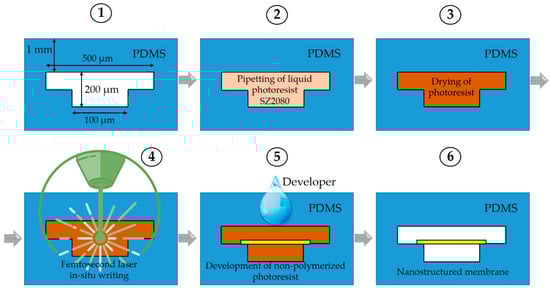 The channel systems were made out of polysiloxane (PDMS). This was chosen for several key reasons. First, it is easy to structure at a hundreds-of-micrometers scale. Second, PDMS is gas-permeable, which is necessary for cell culturing. Finally, it is transparent, mandatory for closed-channel organ-on-a-chip investigations, and allows 3DLL for direct membrane integration. The disadvantage of PDMS is its high hydrophobicity, which means it exhibits moderate adhesion properties. This can be resolved by applying chemical or plasma surface treatment. Therefore, membrane structures are stable and do not delaminate. Alternatively, off-stoichiometry thiol-ene polymer (OSTE) may be considered as an option instead of PDMS. However, with this material, it is not easy to achieve good transparency for the channel structure. This might be suitable for an open channel, but not for closed-channel applications. The fabrication steps proposed in this work are summarized in the following drawing in Figure 2. A systematic description of all the steps is given subsequently in detail in the following sub-sections.
