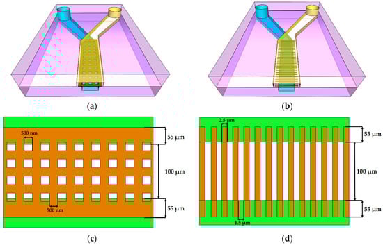 First (a,c) and second (b,d) proposed microfabricated structures, where (a) and (b) are the 3D model of the entire structure including two microfluidic channels with a square grid membrane and a wire membrane; (c) and (d) are 2D top views of the membranes with the annotated dimensions of the periodic structures.