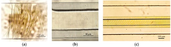 Optical images of laser-printed wire membranes for organ-on-a-chip application, where (a) is printed in the non-fully cured photoresist; (b) is a successfully printed structure in the closed microfluidic channel 100/500 µm with optimally cured photoresist and (c) is a 3D laser lithography (3DLL)-made wire membrane over a 1 cm long microfluidic channel.