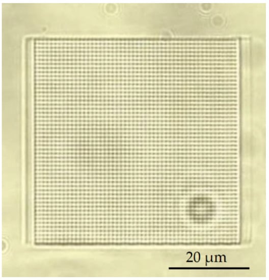 The next challenge of in situ printing that must be addressed is the printing time and complexity of the structure. Because the 3DLL technique writes the structure in a point-by-point fashion, for complex structures, this might take time, depending on the number of geometrical features that need to be printed. For the square-grid membrane, we realized that fabrication using the 3DLL technique was too time-consuming. The test print of the square sample (60 µm side length) is shown in Figure 6. To print over the 1 cm long channel-width structure with the grid structure takes 13 h. Due to the excessively long fabrication time and the possibility of reducing it to 7 h in the case of wires, we decided to pursue the second approach. It is important to stress that this had no negative impact on the functionality of the structure. We were able to achieve an excellent pore density by having sufficient openinga between the channels. As a final note, the printing throughput can be improved even more in the future. Indeed, by using multiplexed beams [] or extremely fast acoustic scanning [], throughput can be expected to improve from 10 to 100 times, making this approach even more accessible for mass implementation.