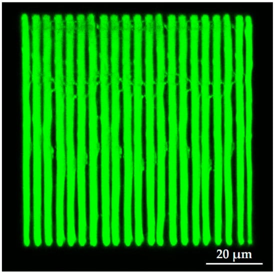 Microstructuring was performed by a 3DLL technique using the “Laser Nanofactory” (Femtika Ltd., Vilnius, Lithuania) setup. We used the femtosecond laser “Carbide” (by Light Conversion), operating at the second harmonic (515 nm), with average power in the range from 0.1 to 10 mW, and a 250 fs pulse duration and repetition rate. More details on the setup can be found in []. Additionally, the technology is extremely adaptive for non-standard samples, such as channel systems, optical fibers, and even semiconductors. This possibility also extends to PDMS channel systems prepared previously. Writing inside close channels is possible due to the imaging system integrated into the setup as well as the possibility to use different focusing objective lenses on demand []. In this particular work we tested 20 × 0.4 NA (1.5 mm focusing distance, Olympus, Tokyo, Japan) and 20 × 1.4 NA (0.32 mm focusing distance, Carl Zeiss AG, Jena, Germany) lenses.