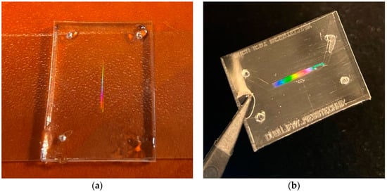 To confirm by experiment that the fabricated structure was periodic and exhibited excellent microstructural accuracy properties, we considered the diffraction properties of the fabricated PDMS sample with the membrane relating to visible light. The realized wire membrane was effectively a one-dimensional periodic structure, similar to a 1D diffraction grating. According to the classical theory of Bragg reflections, such a 1D periodic structure creates the constructive interference of waves reflected from subsequent interfaces. This results in a separation of white light into the major colors of the complete spectrum, which can be observed visually under white light illumination. The mentioned effect occurs due to reflection grating, which is essentially a surface with fine grooves: in this case, pores. Figure 8 confirms this effect, as we see the separation by colors corresponding to different wavelengths. This is thanks to the periodic membrane structure, which confirms the accuracy of the fabricated periodic device.