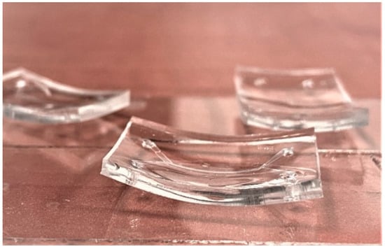 The development of the printed structures in a closed channel using the “ship-in-a-bottle” strategy is the most challenging part of the whole process, because of the limited access of the liquid developer to the channel. The development step removes an unpolymerized substrate, thereby opening the channels completely, i.e., there is no leftover residue material which could block the channels for the cell to be introduced when needed. The organic solvent 4-methyl-2-pentanone gently develops non-polymerized photoresist SZ2080. An alternative solvent, 2-propanol, is a more aggressive option compared to 4-methyl-2-pentanone. Both materials are particularly suitable for open structures, where the liquid has free access from all directions. However, they are not suitable for development in a closed microfluidic channel. Acetone is the most aggressive solution and, therefore, able to develop the rest of the non-polymerized photoresist even with low accessibility. All solvents deform the PDMS body substantially, as noted in [] and shown in Figure 9. The PDMS sample is bent after being introduced to a solvent. This mechanical deformation poses a significant challenge in development. It results in deformation and thereby damage to the printed structures, as exemplified in Figure 10. Luckily, in an open channel, the wire membrane still maintains its functionality and mechanical stability, since one can use the gentler solvent material 4-methyl-2-pentanone.