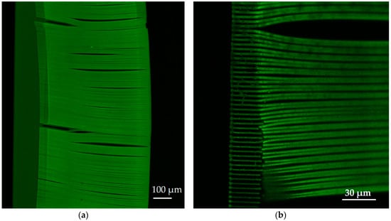 Before 3DLL can be performed in a closed microfluidic channel, the photoresist for structuring has to be loaded and condensed inside. These two steps determine the possibility of printing and the resulting mechanical quality of the manufactured membrane. The main challenge that has to be considered at any fabrication stage in a closed channel is the appearance of gas bubbles in the channel. The presence of bubbles can result in defects in the fabricated structure due to the absence of the photoresist in the polymerization area. There are several mechanisms of how air bubbles can appear in a closed channel. First, they may appear during the loading of the liquid polymer inside the channel due to the non-uniform stream of liquid resin. Second, bubbles may also appear during the condensation of the photoresist in the channel. Therefore, the optimal time of curing needs to be determined as part of the overall process preparation. This is not an issue in standard sample preparation, as gas can freely escape from a resin drop on a glass substrate. Trying to print structures in a non-fully cured photoresist results in mechanically unstable structures, which then misalign during the fabrication process (Figure 4a). On the other hand, too much pre-baking time would result in volumetric changes of the loaded material in the channel. This leads to empty spaces, i.e., bubbles. In this case, we determined empirically that the optimal curing time was 45 min at 50 °C. This was 15 min less than the drying of photoresist in an open environment. The printed wire membrane, obtained with the care of both aspects, is shown in Figure 4b. As opposed to the structure in Figure 4a, the structure in Figure 4b is fully aligned and has a very stable, accurate repetitive separation between the wires and can be used as a periodic wire array.