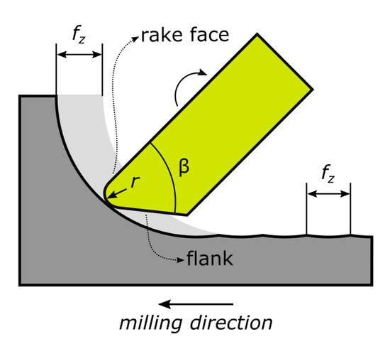 Figure 1. Illustration of the tool parameters wedge angle β and cutting edge radius r along with single tooth feed fz and milling direction.