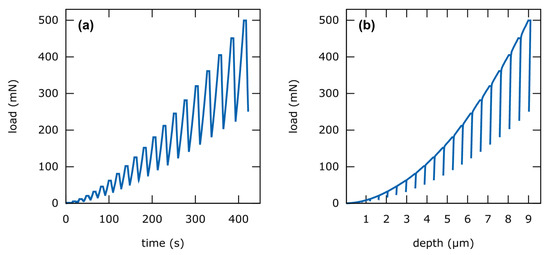 In this work, we used the so-called Enhanced Stiffness Procedure (ESP) implemented in the Picodentor HM500 (Helmut-Fischer GmbH, Sindelfingen, Germany) which is used for indentation. Here the maximum test load is applied in several partial load cycles each one followed by a partial relief cycle. A time-load diagram of the used ESP-procedure is shown in Figure 3a. The entire measurement is performed at the same location until the maximum test load is reached.
