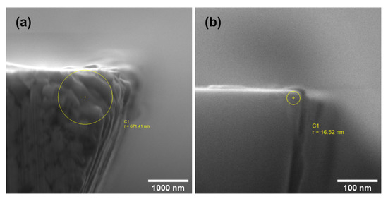 Cutting edge radii approximated on the basis of the SEM images shown in Figure 5 are 671 nm and 17 nm for the SC-tool and MD-tool respectively. The image of the MD-tool (Figure 5b) is magnified ten times as much as the image of the SC-tool (Figure 5a). Yet, it was challenging to determine the cutting edge radius of the MD-mill because it is extremely small. The radius of the SC-tool is 35 times larger than the MD-tool radius.