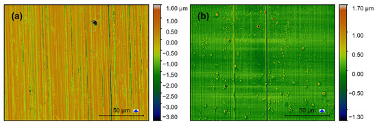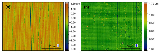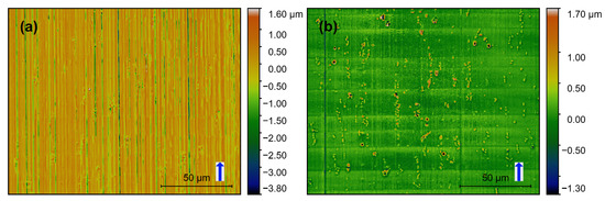 Figure 8. Confocal images of AA6082 surfaces milled with fz = 3 μm: (a) SC-tool, (b) MD-tool.