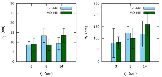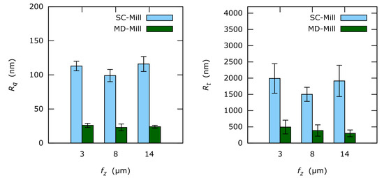 Line roughness measured parallel to the milling direction (i.e., vertical roughness) is represented in Figure 11. Both Rq and Rt are almost equal regardless of the used tool. Yet, Rt seems to correlate with fz at least for MD-milled surfaces. The achieved vertical roughness values are much lower compared to the horizontal roughness seen in Figure 12.
