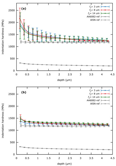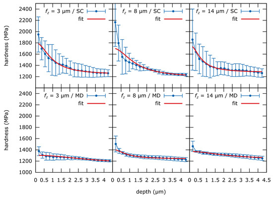 Indentation hardness is an averaged value from a plastically deformed volume below the indenter [19]. Therefore, hardness measured at a certain depth is not the actual hardness at this depth. To achieve additional information about the strain-hardened layer due to micro-milling (i.e., bulk hardness, the hardness of the strain-hardened layer, layer thickness, etc.) a film-substrate model from Equation (1) was fitted to the hardness-depth data.