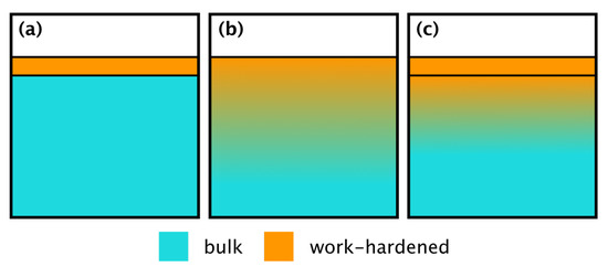 Figure 15 presents principal possibilities of strain-hardening at the material surface. The simplest model is a uniformly hard surface layer on top of softer bulk material (Figure 15a). This model also corresponds with the film-substrate-hardness model of Korsunsky [22]. The next possibility is a gradually hardened surface (Figure 15b). Here the maximum hardness at the surface decreases continuously towards the bulk. The last is the combination of the first two models which implies a uniformly hard surface layer and gradually decreasing hardness below it (Figure 15c).
