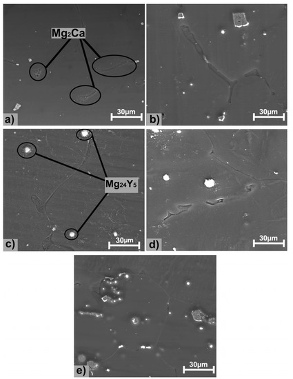 Surface SEM images of the Mg-0.5Ca-xY: (a) Mg-0.5Ca-0.5Y; (b) Mg-0.5Ca-1.0Y [57]; (c) Mg-0.5Ca-1.5Y; (d) Mg-0.5Ca-2.0Y [57]; (e) Mg-0.5Ca-3.0Y [57].