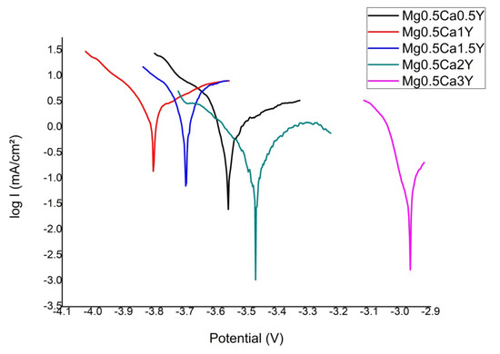 Tafel diagrams of Mg-0.5Ca-xY-based experimental alloys.