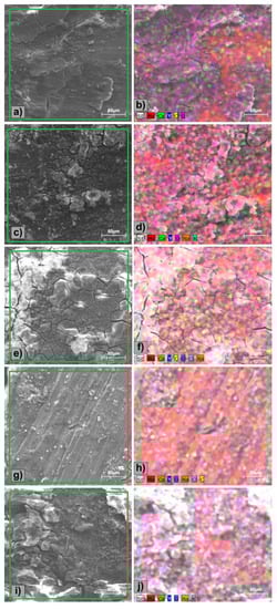 Distribution of the identified elements on the surface of the Mg-0.5Ca-xY alloys after electrochemical tests: (a,b) Mg-0.5Ca-0.5Y; (c,d) Mg-0.5Ca-1.0Y; (e,f) Mg-0.5Ca-1.5Y; (g,h) Mg-0.5Ca-2.0Y; and (i,j) Mg-0.5Ca-3.0Y.