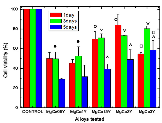 Cell viability profile (%) evaluated by 3-(4,5-dimethylthiazole-2-yl)- 2,5-diphenyltetrazolium bromide - (MTT)-assay: Effect of Mg-0.5Ca-xY experimental alloys on cell viability after 1, 3, and 5 days of co-incubation. Data expressed as percent related to the negative control. (˄; o; ●; ˅; □) No significant differences on cell viability (p > 0.05); see details in the text.