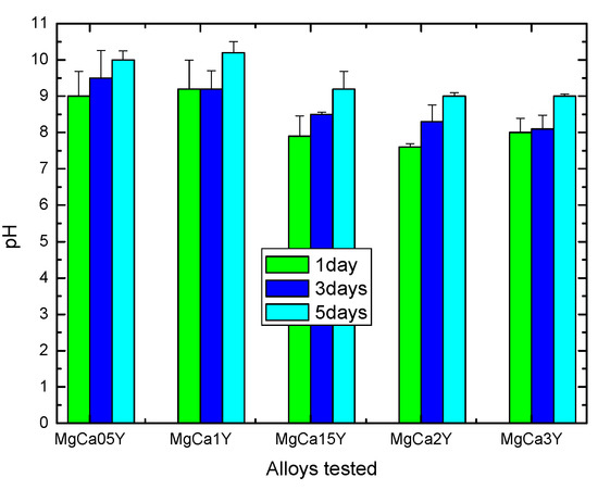 Cell viability after 5 days decreased at values around 50%, especially for alloys with Y content of 1.5, 2.0, and 3.0 wt.% (and below 50% for other alloys), and these findings could be attributed to many factors such as modification of the pH values (as is shown in Figure 8) that may affect cell metabolic activity, ionic massive release from alloys, and precipitation of salts with inhibitory or toxic effect, the increase of osmolarity as a consequence of reactivity that may lead to hyperosmotic shock [61]. It is true that any inhibitory or cytotoxic effect is of concern regarding the potential in vivo cytotoxicity, but only the in vitro cytotoxicity data not essentially discard the biomaterials’ potential use in clinical application [60], because of different real corrosion/degradation scenario of Mg-alloys under biomedical applications (i.e., both composition and flow of biological fluids) that may affect the local surface chemistry of the implants.