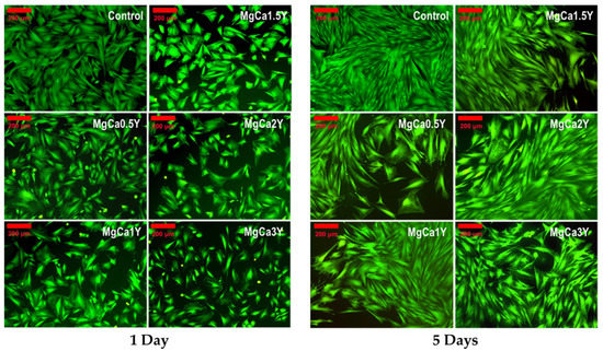 Figure 9 shows the observation performed by fluorescence microscopy on fibroblast cells density and morphology, coincubated with the studied alloys, for 1 day and 5 days. It is observed that after 1 day the cell density evidenced for the alloys is lower than that of the control-wells (i.e., negative control, containing only cells without metallic samples). Moreover, different cell morphology is observed, in the sense of an elongated aspect with bipolar morphology in areas with greater cell density, and a polygonal morphology with wide lamellipodia cytoplasmic processes in areas with low cell density. Furthermore, polygonal morphology was observed towards the center of the well and in the immediate surrounding area of the insert membrane where cell density was lower. Different cell morphology can also be attributed to different concentrations of Ca, Mg, and Y ions in the well microenvironment, knowing that Ca is associated with a structural role in the reorganization of cytoskeleton elements [62], whereas the accumulation of Mg ions over a certain limit may have an inhibitory effect [63]. However, it should be noted that all of the physico-chemical processes taking place during the degradation process of Mg alloys depend on the microenvironment conditions [64] and, from this point of view, under amicroenvironment governed by active transport processes (as is the case of the in vivo degradation), these physico-chemical phenomena may be very well balanced and the results of in vivo biodegradation and osteointegration are somehow optimal. Accordingly, in order to prove the biocompatible behaviour of the studied Mg-alloys a pending in vivo study is expected to clarify this concern.