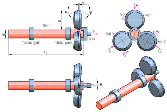 Figure 2 shows the scheme of the analyzed 3-roll skew-rolling process and its key parameters. The process of rolling with 4 rolls differs from that shown in Figure 2 with respect to the location of the rolls—they are located on the circumference of the workpiece at an angle of 90° in the former and at an angle of 120° in the latter.