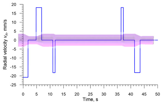 The rolls used in the two analyzed processes have different outside diameters: D = 500 mm (3-roll method) and D = 300 mm (4-roll method). Other parameters of the rolls are identical in both processes, i.e., α = 25°, β = 30° and b = 20 mm. The rolls are set askew to the axis of the workpiece at θ = 5°. The correct shape of a rolled axle depends on coupling the radial movement of rolls with the axial movement of the chuck. In the processes under analysis, the chuck moves with a constant axial velocity of vC = 50 mm/s during the entire forming process, whereas the radial velocity of the rolls, vR, changes during the rolling process, as shown in Figure 3. It is also worth noting that the rolls are rotated in the same direction at the constant rate of rotation nR = 60 rpm.