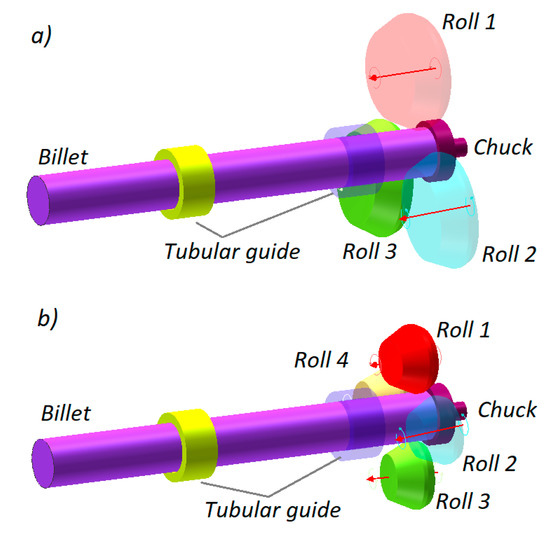 Figure 4 shows two geometrical models of the analyzed rolling processes. Each model consists of rigid tools (rolls, chuck and tubular guides) and a billet that was modelled using 8-node hexahedral elements. The number of the elements was increased during the calculations due to, primarily, mesh refining resulting from a change in the workpiece shape, ultimately yielding a total of 41,000 elements. During the entire forming process that is 50 s long, the tools move in the above described manner. Additionally, the chuck can perform passive rotation caused by the rotating workpiece.