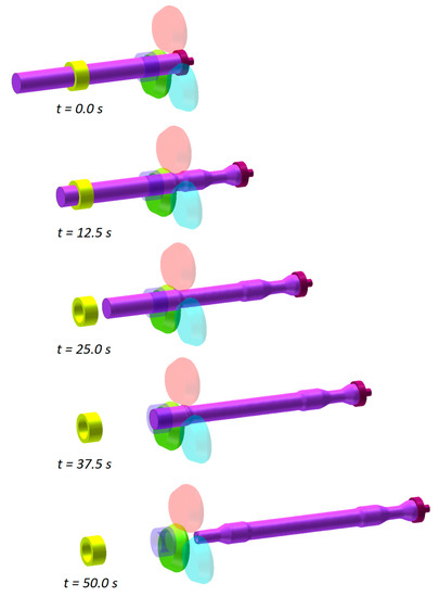 The numerical results indicate that the rolling process runs correctly in all analyzed cases (Figure 5). The railway axle shape is correct and the forming process is free from uncontrolled slipping or necking of the formed step. Below is given a detailed description of problems that occur in the rolling of hollow and solid axles. Furthermore, the effect of the number of employed rolls on the skew-rolling process is investigated.