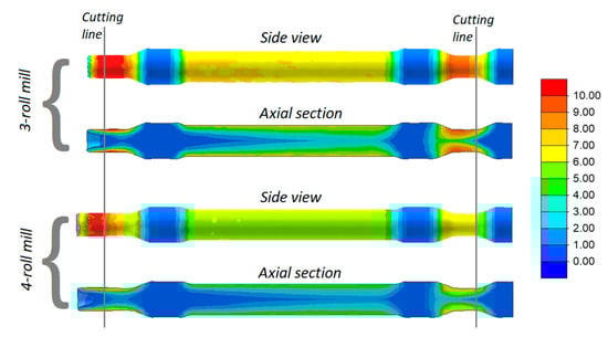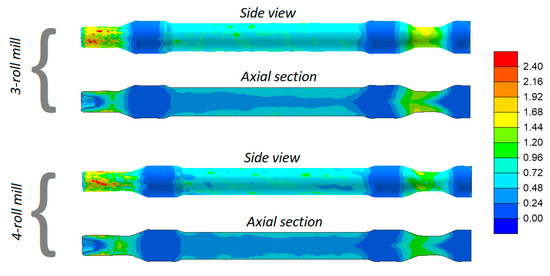 It can be observed that strains in the skew-rolled hollow axles are significantly lower (Figure 13). This results from the fact that a circumferential material flow does not occur because the material can easily flow in a radial direction. Nevertheless, the strains in the rolling of hollow axles (despite being 2.5 times smaller than in the rolling of solid parts) have a characteristic ring-shaped distribution. Moreover, as in the case of solid axles, the strains are slightly higher in the 3-roll skew-rolling process for hollow axles.