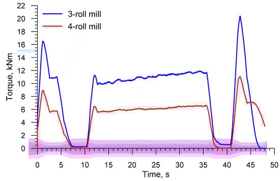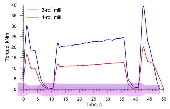 Force parameters obtained in the simulations served as a basis for estimating energy required for producing a railway axle. Figure 9 shows the torques acting on the rolls in the analyzed rolling processes. The torque increases as the cross section of a step workpiece is reduced. The slight increase in the torque is also caused by the material cooling down, which can be observed by analyzing the torque value that is necessary to form the longest, central step on the axle. The mean torque in the 3-roll skew-rolling process is 16,547 Nm, whereas in the 4-roll skew-rolling process it is 9166 Nm. The maximum torques are respectively 39,597 Nm and 20,210 Nm. The fact that the torque is lower in the 4-roll rolling results, among others, from the use of smaller diameter tools. Based on the maximum torque, the engine power for driving the rolls can be estimated. Assuming some surplus, the power is 275 kW for a 3-roll mill and 140 kW for a 4-roll mill.