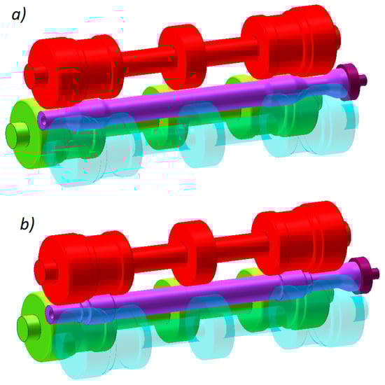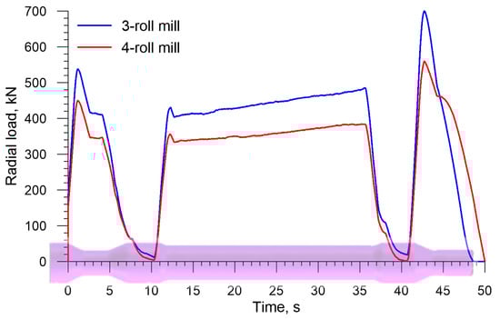 In the skew rolling of hollow axles, radial loads moving the rolls are lower too, as shown by the plots in Figure 18. The highest radial load occurs when the end step located opposite the chuck is formed, and it is 400.4 kN and 351.9 kN for a 3- and a 4-roll mill, respectively. These values are, therefore, 40% lower than those obtained in the rolling of solid axles.