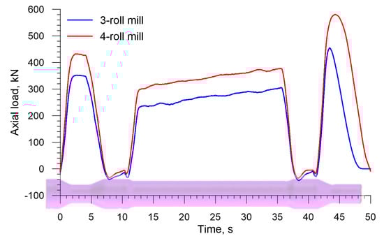 Figure 19 shows the axial load on the chuck in skew rolling hollow axles by 3 and 4 rolls. The behavior pattern of this load is also similar to that observed in the rolling of solid axles, including the fact that this load is negative when the biggest diameter step is formed. The highest axial load determined in the simulations is 219.3 kN for the 3-roll method and 330.7 kN for the 4-roll method.