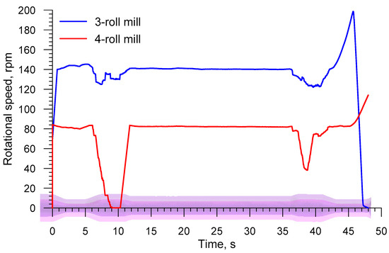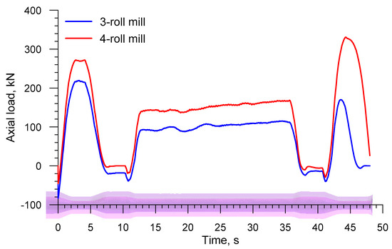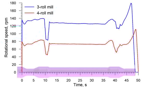 An inverse trend is observed for the axial load on the chuck (the load has the identical direction as the vector of the velocity vC in Figure 2, the distributions of which are shown in Figure 11. The drawing load in the 4-roll skew-rolling process is higher (by approximately 25%) than that in the rolling process performed with the use of 3 rolls. This phenomenon might result from the fact that the rotational speed of the workpiece is significantly lower in 4-roll skew rolling (Figure 12), which leads to a higher feed rate per one deformation cycle. The maximum axial load is 580.4 kN for a 4-roll mill and 455.1 for a 3-roll mill. An interesting fact is the occurrence of a negative load acting on the chuck when the biggest diameter steps are formed. This indicates that the rolling process runs on an independent basis and that the chuck prevents the axial movement of the workpiece.