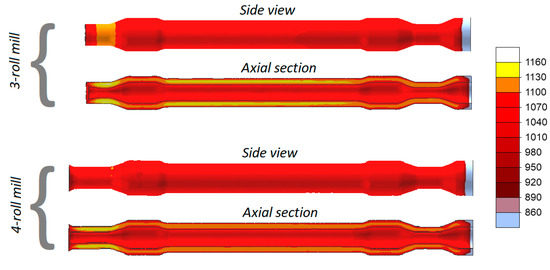 Figure 7 shows the distributions of temperature in the railway axles rolled in both 3- and 4-roll rolling mills. Despite a relatively long forming time, the temperature of the material exceeds 1100 °C (the exception being the workpiece end fixed in the chuck that is removed after rolling anyway). In the 3-roll skew-rolling process, the temperature in some regions of the workpiece is higher than the billet temperature of 1180 °C. This phenomenon is caused by the fact that large amounts of heat are generated by the work of friction and deformation. The material temperature is lower in rolling with 4 rolls, which is caused by the fact that a greater amount of heat is transferred to the rolls that—in this case—have contact with the workpiece over a bigger area.