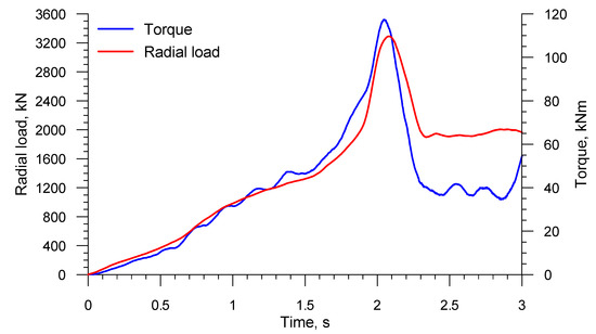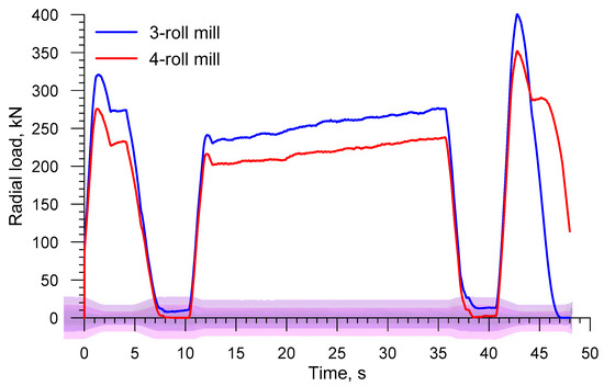 Figure 10 shows the radial loads acting on the rolls in skew rolling a solid axle; in terms of quality, they are similar to the torques. The radial load has the same direction as the vector of the roll velocity vR in Figure 2. It is worth pointing to the fact that this load is relatively low, reaching its highest values (699.7 kN and 559.4 kN for 3- and 4-roll mills, respectively) toward the end of the forming process. The radial load in the 4-roll skew-rolling process is lower by 20%, which results from a smaller material-tool contact surface due to a smaller diameter of the tool.